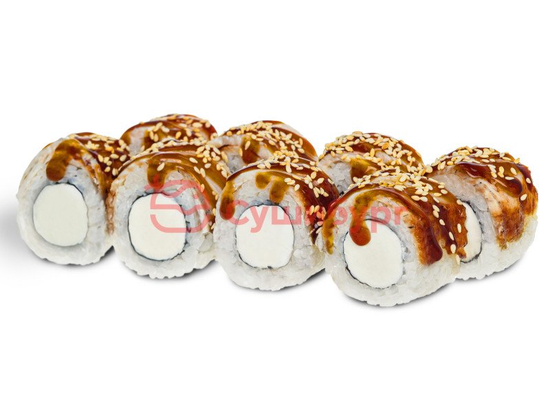 Рис, нори, сыр творожный, кларий угревидный, кунжут, соус унаги.