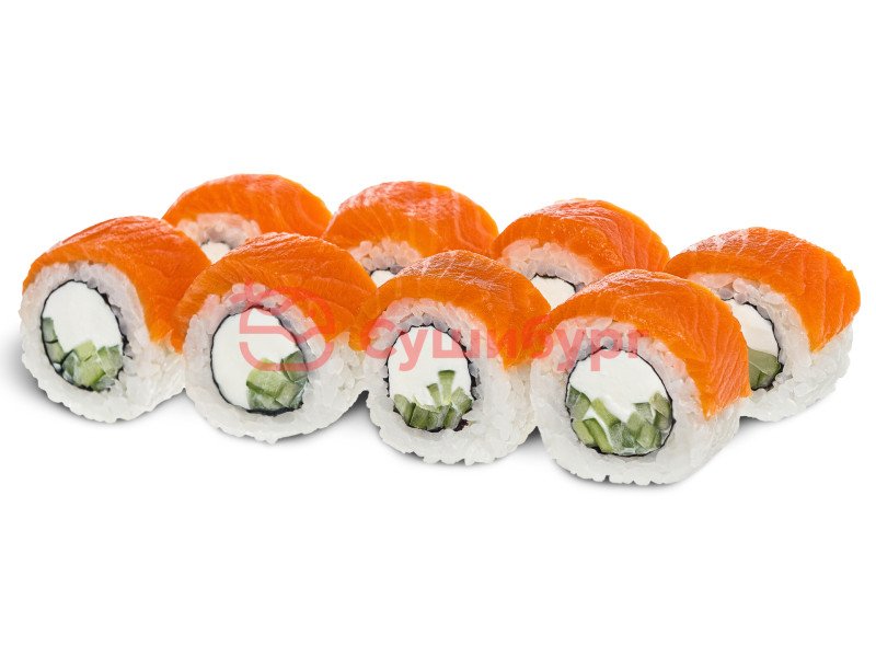 Рис, нори, сыр творожный, огурец свежий, лосось.