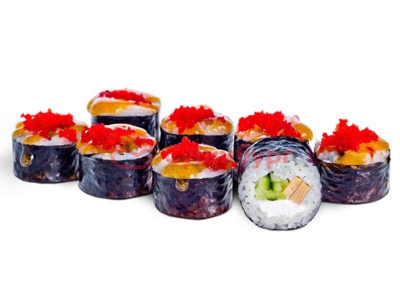 Рис, нори, сыр творожный, японский омлет, огурец свежий, фирменный соус манго-чили, икра масаго.