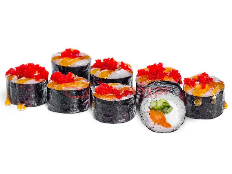 Рис, нори, сыр творожный, огурец свежий, филе лосося, фирменный соус манго-чили, икра масаго.