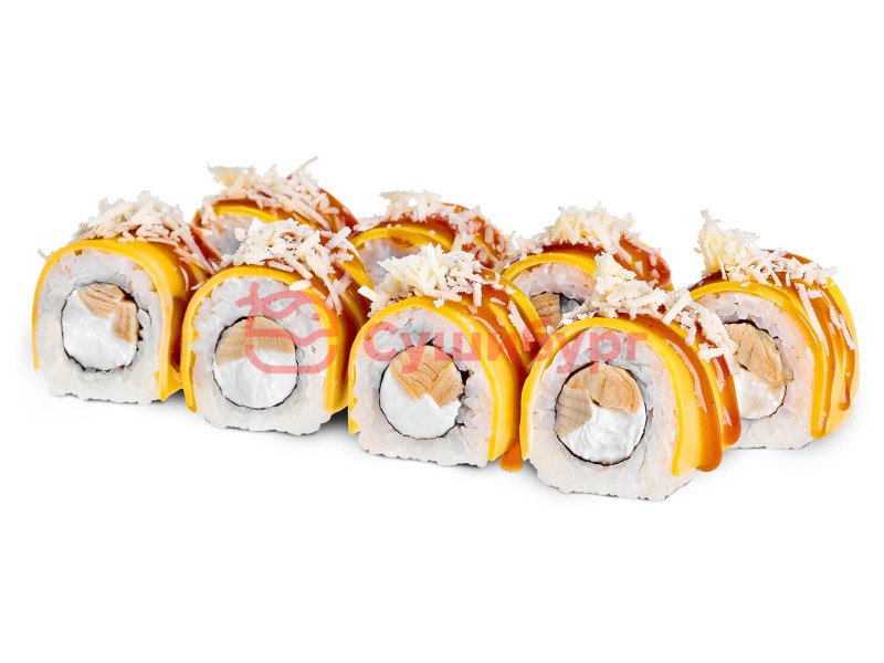 Рис, нори, сыр творожный, японский омлет, сыр чеддер, соус унаги, сыр пармезан.