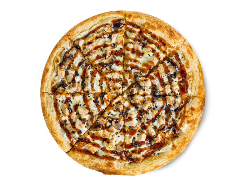 Тесто, соус белый, моцарелла, цыпленок, шампиньоны, соус терияки, кунжут черный.