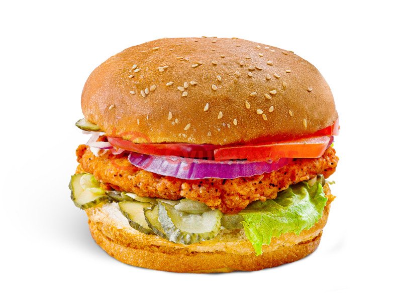 Булочка пшеничная, куриное филе в панировке, корнишоны, лук репчатый, салат айсберг, соус цезарь.