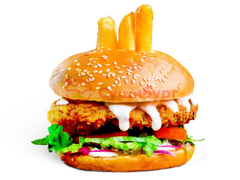 Булочка пшеничная, куриное филе в панировке, картофель фри, салат айсберг, соус пикантный, корнишоны, лук красный, соус сырный.