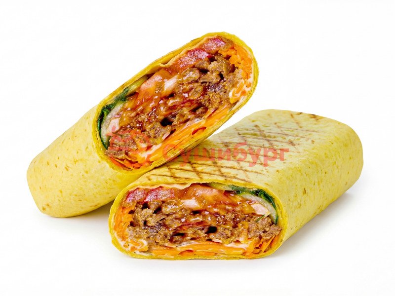Тортилья сырная, томаты, фарш телятины, огурец свежий, лук репчатый, морковь по-корейски, зелень, соус пикантный.