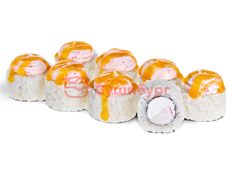 Рис, нори, сыр творожный, снежный краб, мусс луковый, соус манго-чили.