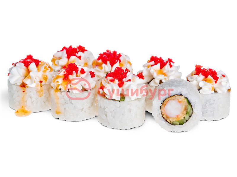 Рис, нори, креветка в темпуре, огурец свежий, сырная шапочка, соус манго-чили сладкий, икра масаго красная.