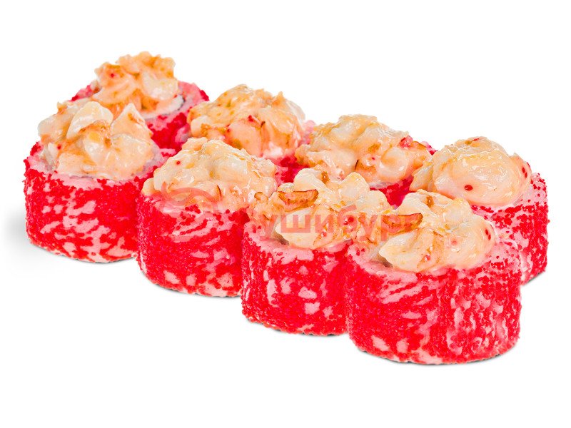 Рис, нори, сыр творожный, огурец свежий, снежный краб, масаго красная, креветка, ореховый соус, унаги соус.