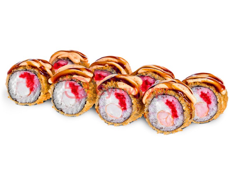Рис, нори, сыр творожный, креветка, икра масаго красная, панировочные сухари, кляр, соус унаги, соус спайси.