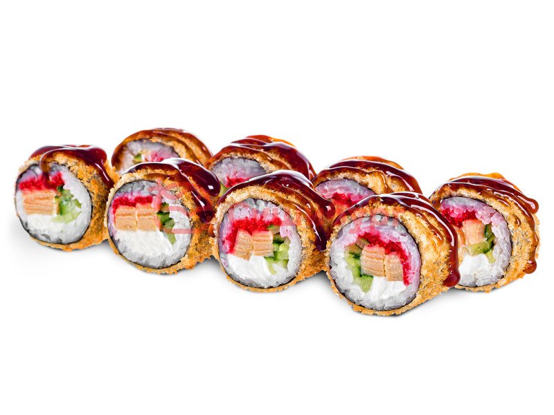 Рис, нори, сыр творожный, омлет, огурец свежий, икра масаго красная, кляр, сухари панировочные, соус унаги.