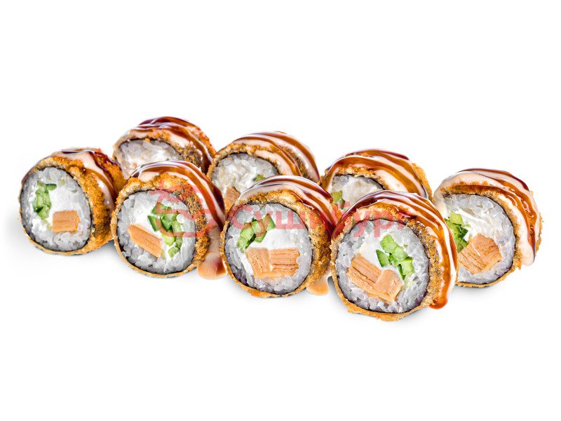 Рис, нори, сыр творожный, огурец свежий, омлет, кляр, сухари панировочные, ореховый соус, соус унаги.